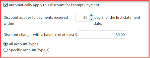 Place a check in the Automatically apply this discount for Prompt Payment box.