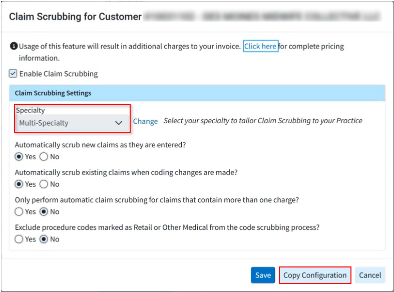 We previously introduced an option within the Claim Scrubbing configuration screen that allows customers to set up or change their specialty to receive more tailored edits for their specific claims. Billing services, in particular, need to be able to use the Copy Configuration option to easily set up all of their customers' claim scrubbing configurations. However, when Copy Configuration was recently used, it was not copying correctly, and we were not setting up Aptarro submitters for any of the customers that had it enabled. In this release, we updated the claim scrubbing configuration window. When a specific specialty is selected, and then the "Copy Configuration" button is clicked, the system will display the selected specialty for each customer in the list. (The normal logic will be used to select a default specialty if one has not been chosen.) Additionally, when a configuration is copied, the system will register all necessary submitters with Aptarro.