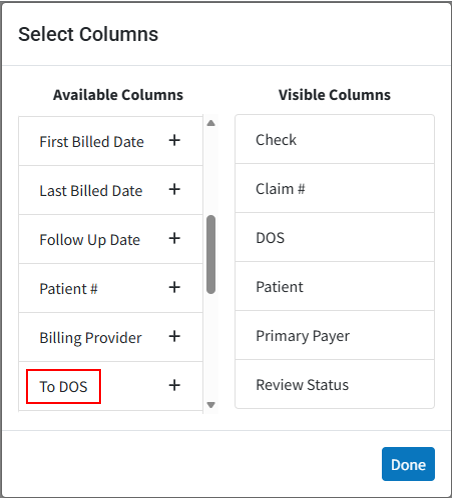 We have always displayed the "From" Date (Date of Service) as a column in our Claim Control, Claim Tracking, and Follow-Up Management tables. This represents the first date of service on the claim. Customers who treat patients for extended periods (especially those using Institutional claims) could not view the complete range of service dates in these tables. In this release, we added the "To" Date (representing the last date of service on the claim) as an optional, hidden-by-default column.