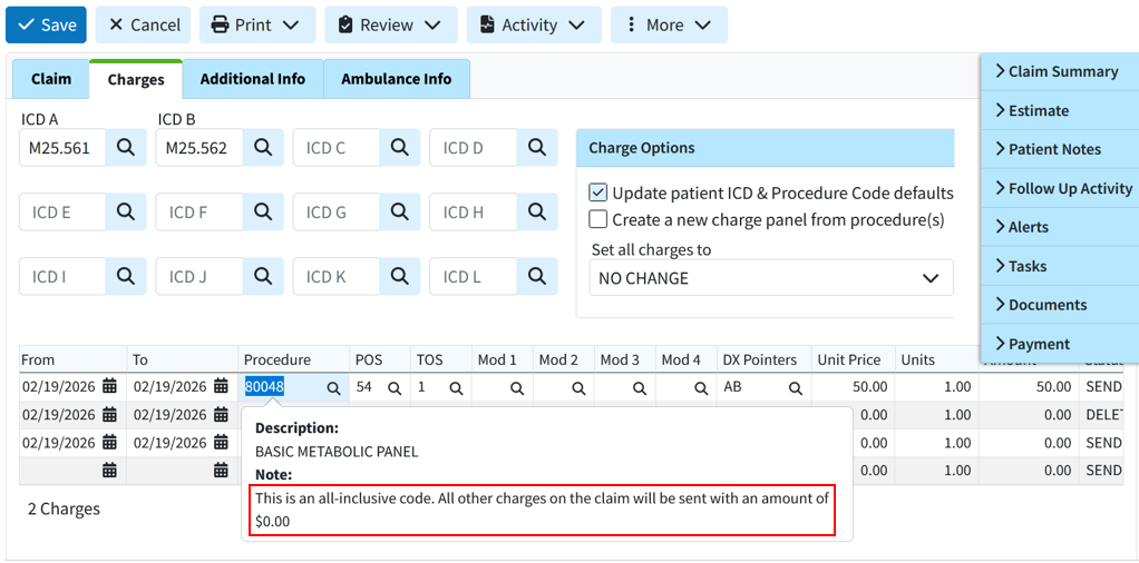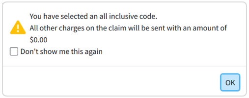 All-inclusive codes are common in Rural Health Clinics and Federally-Qualified Health Centers. In our system, entering a claim with an all-inclusive code triggers a warning. This notification indicates that an all-inclusive code has been selected and explains the impact on other charges. These charges will either not be billed or will be billed with a nominal amount, such as $0.00 or $0.01, depending on system configuration.